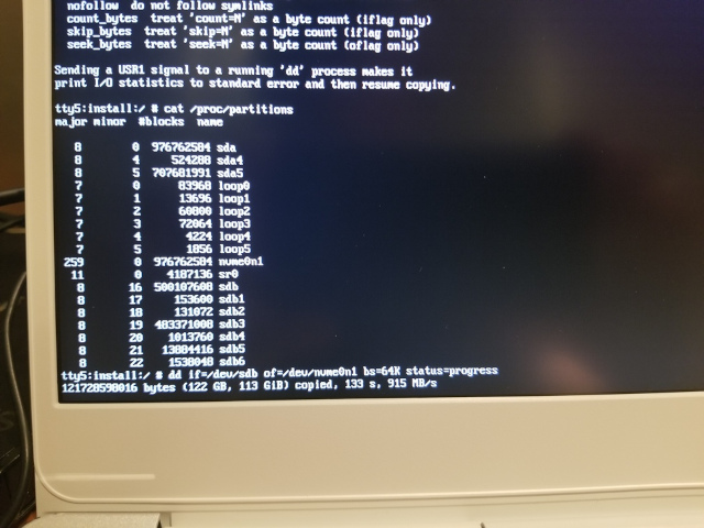 My first attempt, after taking a Linux image of the factory 512 GB SSD was to try to use dd to copy the old drive, byte for byte, onto the new card.
